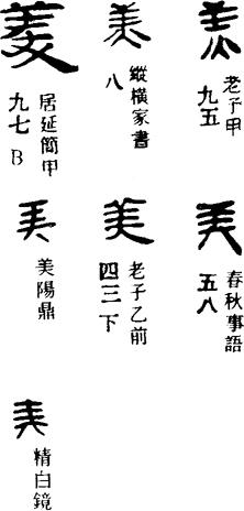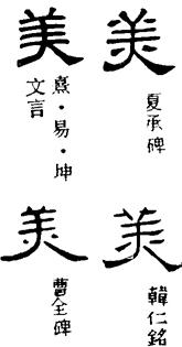 〈辨〉美字甲骨文象人头戴羊头状头饰的样子,表示其人所属部落以羊为图腾,因而有神圣的美感,引申用为美丽字。金文、篆书形体讹变,但从羊从大的基本结构未变,大为正面人形。楷书作美。
