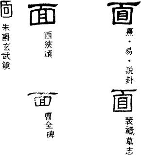 【说明】“面”为象形字,外像脸的轮廓,内为眼睛(面部最主要器官)。参附录三。