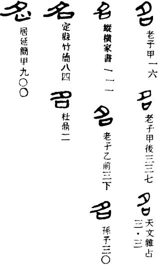 【说明】“名”为会意字,从“夕”从“口”。《说文》认为夜间(夕)人们彼此看不清,所以用口自道其名。