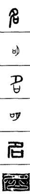 从上到下依次是小篆、甲骨文、金文、古玺及战国文字、缪篆及汉代文字、鸟虫篆。