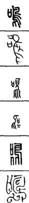 从上到下依次是小篆、甲骨文、金文、古玺及战国文字、缪篆及汉代文字、鸟虫篆。