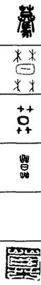 从上到下依次是小篆、甲骨文、金文、古玺及战国文字、缪篆及汉代文字、鸟虫篆。