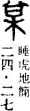 某为“梅”的本字。《说文解字》:“某,酸果也。”古文字的某字,象树上结果之形;又有人认为某字从木从甘,表示果实酸甜之意。总之,某的本义是指树上结的酸果。此字后来多用为代词,代指一定的或不定的人、地、事、物等,而另造“梅”字来表示它的本义。