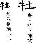 ①雄性的鸟、兽,与“牝”相对。《诗经·邶风·匏有苦叶》:“雉鸣求其牡。”《史记·龟策列传》:“禽兽有牝牡。”引申指男性。苏轼《扬雄论》:“人生而莫不有饥寒之患、牝牡之欲。”又引申特指男性生殖器。东方朔《神异记》:“男露其牡,女张其牝。”(牝:指女性生殖器。)②锁簧,门闩。《淮南子·说林》:“盗跖见饴,曰:‘可以黏牡。’”《汉书·谷永传》:“城关守国之固,固将去焉,故牡飞。”③丘陵。《大戴礼记·易本命》:“丘陵为牡,溪谷为牝。”