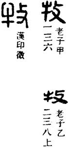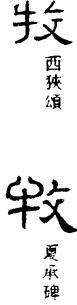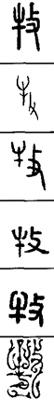 〈辨〉牧字甲金文象手持棍棒或鞭子放牛的样子,牛也是声符。篆书讹变作从牛从攴;攴,读pū,详见敲字下。楷书讹变作牧。