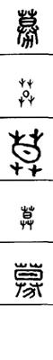从上到下依次是小篆、甲骨文、金文、古玺及战国文字、缪篆及汉代文字、鸟虫篆。