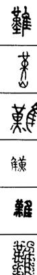 从上到下依次是小篆、甲骨文、金文、古玺及战国文字、缪篆及汉代文字、鸟虫篆。