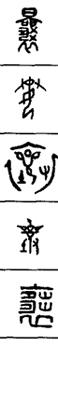 从上到下依次是小篆、甲骨文、金文、古玺及战国文字、缪篆及汉代文字、鸟虫篆。