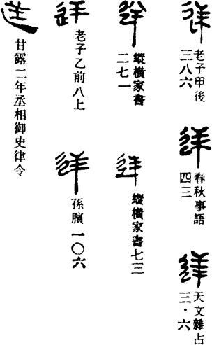 从上到下依次是小篆、甲骨文、金文、古玺及战国文字、缪篆及汉代文字、鸟虫篆。