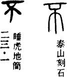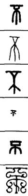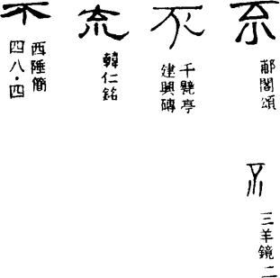 从上到下依次是小篆、甲骨文、金文、古玺及战国文字、缪篆及汉代文字、鸟虫篆。