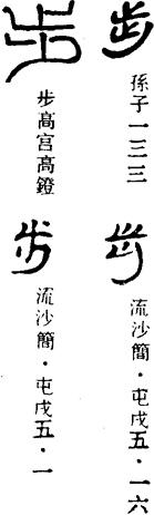 【说明】“步”为会意字,由左右二“止”(像脚形)组合而成,表示两脚一前一后走路的意思。参附录三。