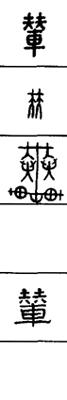 从上到下依次是小篆、甲骨文、金文、古玺及战国文字、缪篆及汉代文字、鸟虫篆。