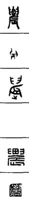 从上到下依次是小篆、甲骨文、金文、古玺及战国文字、缪篆及汉代文字、鸟虫篆。