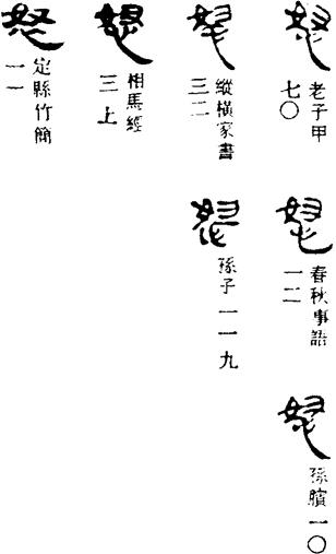 从上到下依次是小篆、甲骨文、金文、古玺及战国文字、缪篆及汉代文字、鸟虫篆。