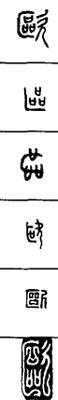 从上到下依次是小篆、甲骨文、金文、古玺及战国文字、缪篆及汉代文字、鸟虫篆。