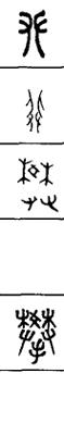 从上到下依次是小篆、甲骨文、金文、古玺及战国文字、缪篆及汉代文字、鸟虫篆。