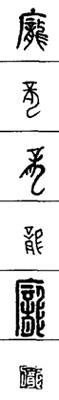 从上到下依次是小篆、甲骨文、金文、古玺及战国文字、缪篆及汉代文字、鸟虫篆。