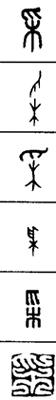 从上到下依次是小篆、甲骨文、金文、古玺及战国文字、缪篆及汉代文字、鸟虫篆。