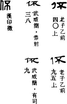 馬王堆帛書《老子》乙本卷前古佚書《論約》:“伓天之道,國乃無主。”又帛書《十六經·五正》:“反義伓宗,其法死亡以窮。”又帛書《經法·四度》:“伓約則窘,達刑則傷。伓逆合當,為若有事,雖无成功,亦无天央(殃)。”影本注疑伓為倍之異體,與背通。郭店楚簡《緇衣》簡二五:“信以結之,則民不伓。”伓今本《禮記·緇衣》作倍,亦應讀背。倍見詛楚文:“兼倍十八世之詛盟……倍盟犯詛。”郭店楚簡本《老子》甲簡一:“絶智棄(辯),民利百伓。”伓王弼本作倍。按《集韻》伓為伾之異體。《説文》:“倍,反也。”後作背。《左傳·昭公二十六年》:“倍奸齊盟。”又武威簡《泰射》:“群工伓於後。”《有司》九:“伓設於南。”今本《儀禮》伓並作陪,陪亦从咅音。