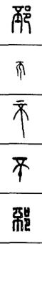 从上到下依次是小篆、甲骨文、金文、古玺及战国文字、缪篆及汉代文字、鸟虫篆。