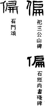 ①不正,偏私。《吕氏春秋·士容》:“士不偏不党。”(党:结党。)杜甫《夏夜李尚书筵送宇文石首赴县联句》:“夜久烛花偏。”引申为偏激,邪曲。《后汉书·孔融传》:“故发辞偏宕,多致乖忤。”《新唐书·后妃传下·宪宗郭后》:“毋拒直言,勿纳偏言。”②边,半边。《左传·隐公十一年》:“郑伯使许大夫百里奉许叔以居许东偏。”《吕氏春秋·士容》:“故火烛一隅,则室偏无光。”特指半身不遂。《荀子·非相》:“禹跳,汤偏。”(跳:脚跛。)引申为部分。《荀子·天论》:“万物为道一偏,一物为万物一偏。”又引申为片面。《汉书·韦玄成传》:“礼文缺微,古今异制,各为一家,未易可偏定也。”③边远,僻远。《史记·扁鹊仓公列传》:“先生过小国,幸而举之,偏国寡臣幸甚。”陶潜《饮酒》之五:“心远地自偏。”④副佐。《左传·襄公三十年》:“且司马,令尹之偏。”《三国志·魏书·张扬传》:“征天下豪杰,以为偏裨。”⑤古代兵车建制单位,二十五乘为偏。《左传·桓公五年》:“先偏后伍。”《尉缭子·制谈》:“古士有什伍,车有偏列。”(什伍:古代军队编制,五人为伍,十人为什。泛指军队基层建制。)⑥偏偏。《汉书·外戚传上·孝武李夫人》:“立而望之,偏何姗姗其来迟!”⑦特别,最。刘长卿《送李穆归淮南》:“老人偏畏过芳菲。”⑧正,恰。皇甫冉《曾东游以诗寄之》:“正是扬帆时,偏逢江上客。”⑨只,独,单单。鲍照《梅花落》:“中庭杂树多,偏为梅咨嗟。”⑩多,深。黄滔《壶公山》:“鹤归悬圃少,凤下碧梧偏。”元稹《酬窦校书廿韵》:“音徽千里断,魂梦两情偏。”⑾通“谝pián”。谄媚。《庄子·人间世》:“故忿设无由,巧言偏辞。”《朝野佥载》卷三:“上林令侯敏偏事之。”⑿通“遍”。普遍,全面。《墨子·非儒》:“远施周偏。”《汉书·贾谊传》:“彼自丞尉以上偏置私人。”