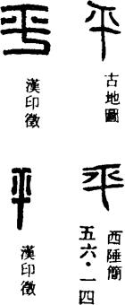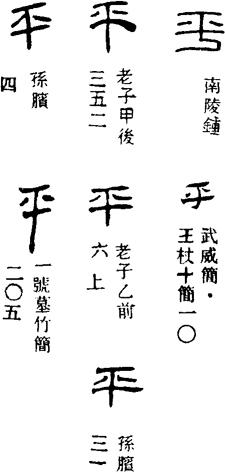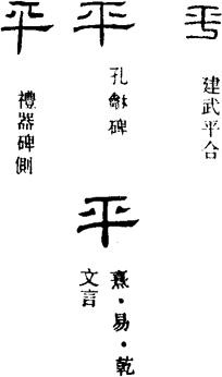 〈辨〉平字金文上从一,表示平的意思,为形符;下部同采的古文,以采为声符。篆书讹为从兮从一,表示口气的平舒。楷书作平,不可分析。