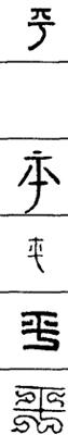 从上到下依次是小篆、甲骨文、金文、古玺及战国文字、缪篆及汉代文字、鸟虫篆。