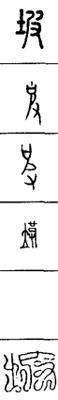从上到下依次是小篆、甲骨文、金文、古玺及战国文字、缪篆及汉代文字、鸟虫篆。