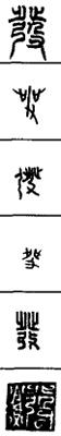 从上到下依次是小篆、甲骨文、金文、古玺及战国文字、缪篆及汉代文字、鸟虫篆。