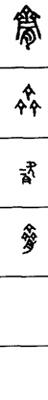 从上到下依次是小篆、甲骨文、金文、古玺及战国文字、缪篆及汉代文字、鸟虫篆。