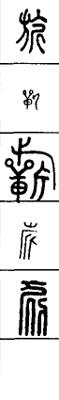 从上到下依次是小篆、甲骨文、金文、古玺及战国文字、缪篆及汉代文字、鸟虫篆。