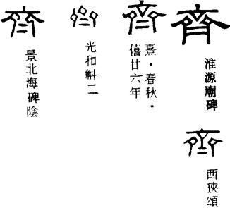 者九鐘銘:“乃有齊休祝成。”郭沫若《者九鐘銘考釋》解為:“齋戒祝禱均獲神庥。”讀齊為齋。又馬王堆帛書《五十二病方·□闌(爛)者方》:“去故般(瘢):善削瓜壯者,而其瓣材其瓜,其□如兩指,以靡(磨)般令□□之,以□□傅之。乾,有(又)傅之,三而已。必善齊戒,毋□而已。”按《禮記·王制》:“天子齊戒受諫。”釋文:“齊本又作齋。”
