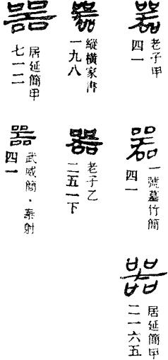 ①陶器。《老子》第十一章:“埏埴以为器。”(埏shān:揉和。埴zhí:粘土。)引申为用具,器皿。《论语·卫灵公》:“工欲善其事,必先利其器。”《韩非子·显学》:“冰炭不同器而久。”比喻可以凭借的手段。《礼记·礼运》:“礼义以为器,故行事有考也。”特指标志名位、爵号的器物。《左传·成公二年》:“唯器与名,不可以假人。”(假:借。)代指权力,政权。《周易·序卦》:“主器者莫若长子。”②度量,胸襟。《论语·八佾》:“管仲之器小哉!”《晋书·张华传》:“器识弘旷,时人罕能测之。”③才干,能力。《周易·系辞下》:“君子藏器于身,待时而动。”《三国志·蜀书·诸葛亮传》:“亮之器能政理,抑亦管、萧之亚匹也。”又指有才能的人,人才。《老子》第四十一章:“大器晚成。”《世说新语·赏誉》:“若周子居者,真治国之器也。”引申为认为有才能,器重,赏识。《汉书·翟方进传》:“上亦器其能,遂擢方进为丞相。”孟郊《吊国殇》:“尧舜宰乾坤,器农不器兵。”④具体的事物。《周易·系辞上》:“形而上者谓之道,形而下者谓之器。”《文心雕龙·情采》:“敷写器象。”