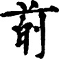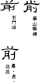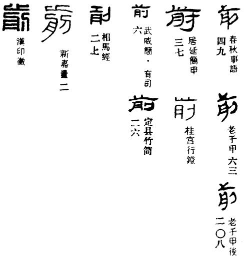 【说明】“前进”之“前”本作“歬”。“歬”为会意字,从止在舟上,不行而进之意。参附录三。后“歬”被“前”代替。“前”本古“剪”字,截断之意。“前”代替“歬”后,又借“翦(俗作“剪”)”字为截断之“前”。