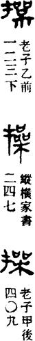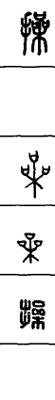 从上到下依次是小篆、甲骨文、金文、古玺及战国文字、缪篆及汉代文字、鸟虫篆。
