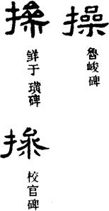 〔变体〕《毛诗传笺通释》卷八云:“魏晋间避武帝讳,凡从‘喿’之字多改从‘參’,八分‘喿’字多写从‘叅’,形近易误。《北山》诗‘或惨惨畏咎’,《释文》:‘惨本作操。’《抑》诗‘我心惨惨’,张参《五经文字》作‘懆’。馀如‘劳心惨兮’、‘忧心惨惨’,并当为‘操’,是其类也。《广雅·释言》:‘掺,操也。’盖其时操多假作掺,故遂以操为掺耳。……《说文》、《玉篇》皆无‘掺’字,盖因魏晋间掺、操不分,浅者误删其一。”