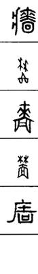 从上到下依次是小篆、甲骨文、金文、古玺及战国文字、缪篆及汉代文字、鸟虫篆。