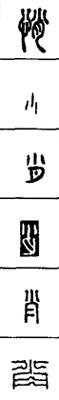 从上到下依次是小篆、甲骨文、金文、古玺及战国文字、缪篆及汉代文字、鸟虫篆。