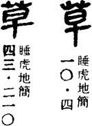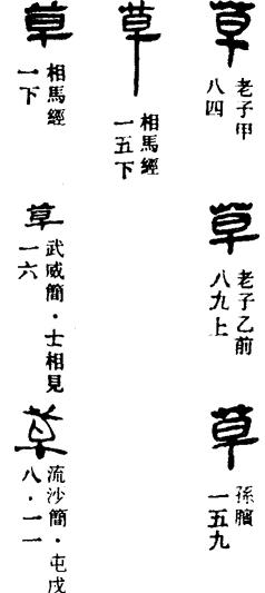 〈辨〉草木之草的本字为艸,古文字字形见艺字下,象杂草丛生之形,凡草本植物之字多从艸。后艸字单用写作草;草本为草斗即皂斗(栎实)的皂的专字,因为草借用为艸,为它的本义别造皂字。皂本作阜,在早上加一撇为标志,表示读早的音但区别于早;后为与早区别,变作皂◇注意:潦草不得写作了草。