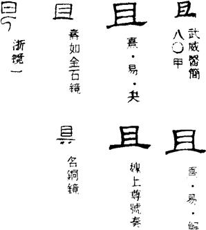 〈辨〉且字甲金文略象男性生殖器的形状,由于父系社会早期男性生殖器崇拜的缘故,最初用为祖妣字,后加形符示作祖。且借用为虚词字。