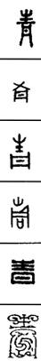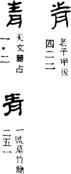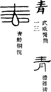 〈辨〉青字金文有二体:一作从丹生声;丹用为泛称,指产生于石的各种颜料,非指丹砂一种,青指青丹。一作从生井声,生象草木出生,其色青。篆书从第一体,仍作从丹生声,楷书讹变作青。青字用作偏旁,表示和青、蓝、黑等颜色有关的意义;也用为声符。