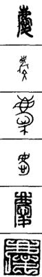 从上到下依次是小篆、甲骨文、金文、古玺及战国文字、缪篆及汉代文字、鸟虫篆。