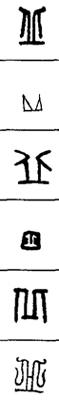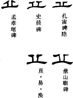从上到下依次是小篆、甲骨文、金文、古玺及战国文字、缪篆及汉代文字、鸟虫篆。