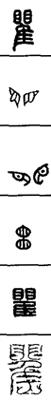 从上到下依次是小篆、甲骨文、金文、古玺及战国文字、缪篆及汉代文字、鸟虫篆。