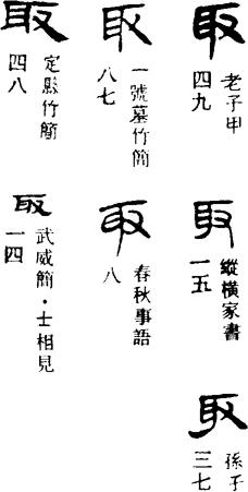 (疑)。”睡虎地秦簡《日書》甲《除》:“陰日利以家室祭祀。家(嫁)子取婦入材大吉。”《日書》甲《秦除》:“收日可以入人民馬牛禾粟,入室取妻及它物。”銀雀山竹簡《三十時》:“不可為嗇夫嫁女取婦禱……”按《左傳·襄公三十年》:“為太子般娶于楚。”《史記·十二諸侯年表》娶作取。又九店M五六楚簡一三下:“凡建日,大吉,利以取妻……”又一七下:“凡寍(寧)日,利以取妻,内(入)人……”