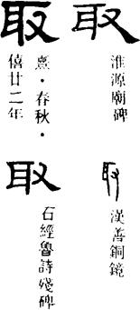 ①(捕获到野兽或战俘时)割下左耳以记功。《周礼·夏官·大司马》:“大兽公之,小禽私之,获者取左耳。”后也称斩获敌人的首级为取。苏轼《阳关词·赠张继愿》:“恨君不取契丹首。”引申为捕捉,捉拿。《吕氏春秋·尊师》:“如山林,入川泽,取鱼鳖,求鸟兽。”(如:往。)《新唐书·权怀恩传》:“赏罚明,见恶辄取。”②拿,拿取。《韩非子·外储说右上》:“杀一牛,取一豆肉,馀以食士。”(豆:古代盛食物的器皿。食sì:让……吃。)苏轼《前赤壁赋》:“苟非吾之所有,虽一毫而莫取。”引申为得到,招致。《战国策·赵策三》:“是我失之于天下而取偿于秦也。”《吕氏春秋·慎大》:“齐荆吴越,皆尝胜矣,而卒取亡。”(尝:曾经。卒:最终。)又引申为求。张衡《西京赋》:“竞媚取荣。”袁宏道《经太华》:“不取色态妍,唯求神骨肖。”今成语有“舍生取义”。③采用,选择。《吕氏春秋·必己》:“伐木者止其旁而弗取。”《史记·仲尼弟子列传》:“孔子闻之曰:‘吾以言取人,失之宰予;以貌取人,失之子羽。’”(宰予、子羽:人名。)④夺取,攻占。《韩非子·说疑》:“其臣弑其君而取国者众矣。”(弑shì:下杀上。)《吕氏春秋·不屈》:“围邯郸三年而弗能取。”⑤娶。后来写作“娶”。《诗经·齐风·南山》:“取妻如之何?必告父母。”⑥用在动词后,表动态,相当于“着”、“得”。李白《短歌行》:“歌声苦,词亦苦,四座少年君听取。”郑燮《予告归里画竹别潍县绅士民》:“写取一枝清瘦竹,秋风江上作渔竿。”⑦通“聚”。聚集。《左传·昭公二十年》:“郑国多盗,取人于萑苻之泽。”(萑huán苻:泽名。)⑧通“趋”。奔跑,奔走。《韩非子·难势》:“王良御之而日取千里。”(王良:人名。)古诗《孤儿行》:“上高堂,行取殿下堂。”