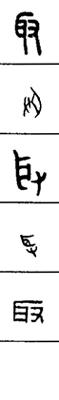 从上到下依次是小篆、甲骨文、金文、古玺及战国文字、缪篆及汉代文字、鸟虫篆。