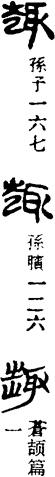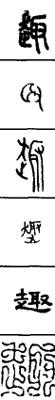 从上到下依次是小篆、甲骨文、金文、古玺及战国文字、缪篆及汉代文字、鸟虫篆。