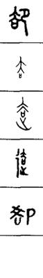 从上到下依次是小篆、甲骨文、金文、古玺及战国文字、缪篆及汉代文字、鸟虫篆。