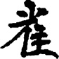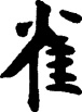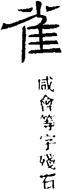 雀字本为象形字。甲骨文的雀字,象一个鸟头形,鸟头顶上有一撮羽毛,它的本义是指麻雀或山雀。由于这类鸟的体形都比较小,所以有时也泛称雀形的小鸟为“雀”。而小篆的雀字也变成从小从隹,成为会意字,专指小鸟。